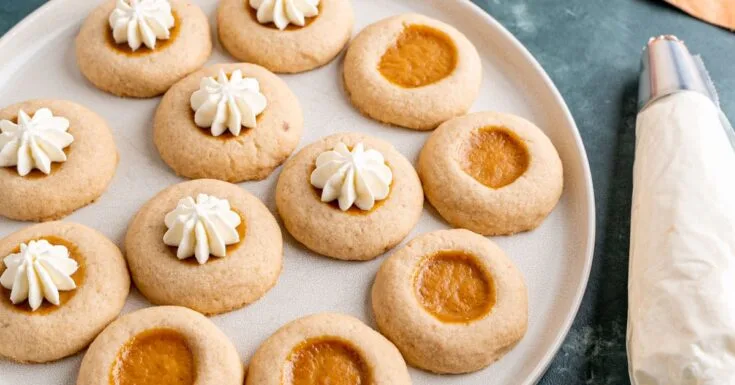 These Pumpkin Pie Filled Thumbprint Cookies are the perfect fall treat—soft, buttery cookies with a sweet and spicy pumpkin filling right in the center. They combine all the cozy flavors of pumpkin pie in a bite-sized, easy-to-make cookie that's sure to be a hit at any gathering or holiday celebration.