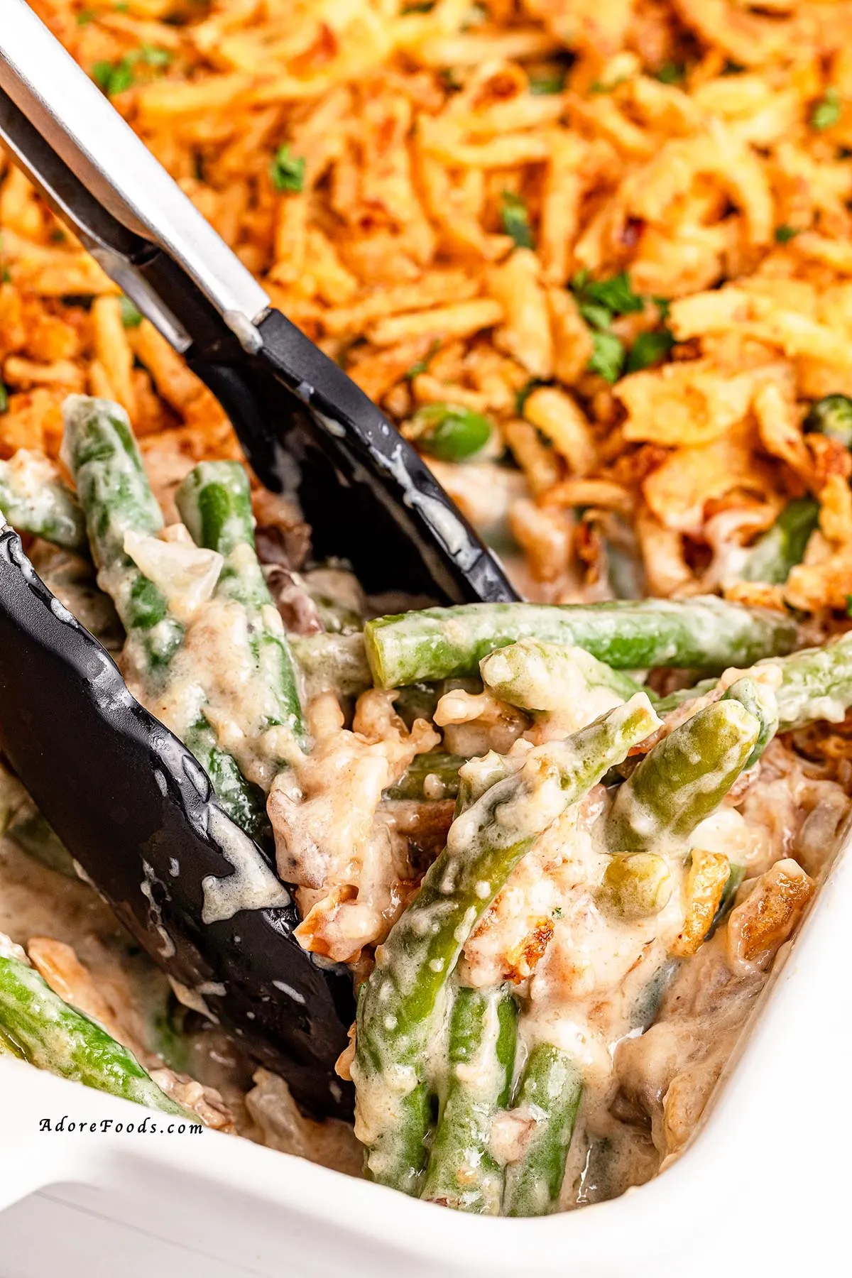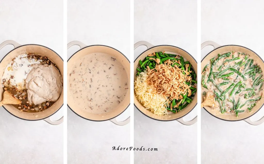 Mix in the beans and extras. Remove from heat. Stir in the blanched green beans, shredded cheese, and ¾ cup of the crispy fried onions. Mix well to coat everything in the sauce.