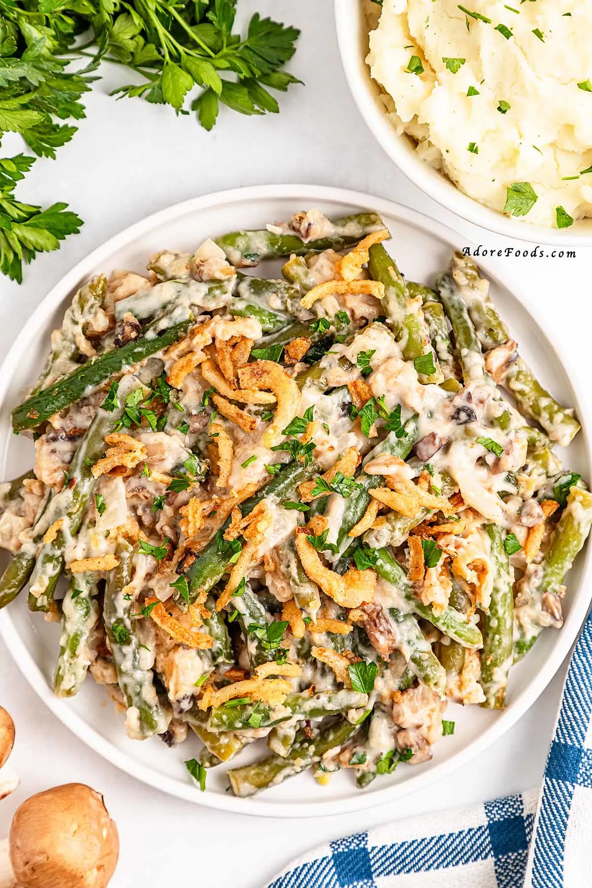 This dish has everything people want in a side—crisp-tender beans, a creamy sauce that feels indulgent but not heavy, and that golden crunchy topping that makes every bite irresistible. It’s nostalgic for those who grew up with the classic, but fresher and richer thanks to real ingredients like sautéed mushrooms, garlic, and a touch of buttermilk for tang.