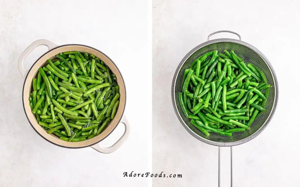 Blanch the beans. Fill a large pot with water and bring it to a boil. Add the green beans and cook for just 2–3 minutes until they turn bright green and slightly tender. Drain immediately in a colander to stop the cooking.