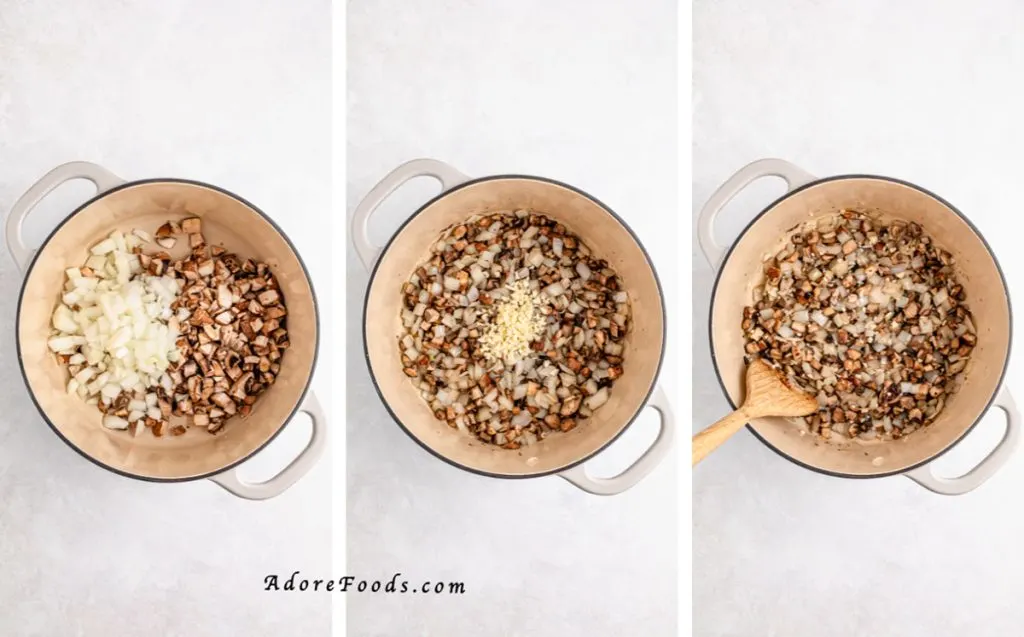 Make the sauce. In the same pot, heat the avocado oil over medium heat. Add the chopped onions and mushrooms. Cook for 3–5 minutes until softened and the onions look translucent. Stir in the garlic and cook 1–2 minutes more until fragrant.
