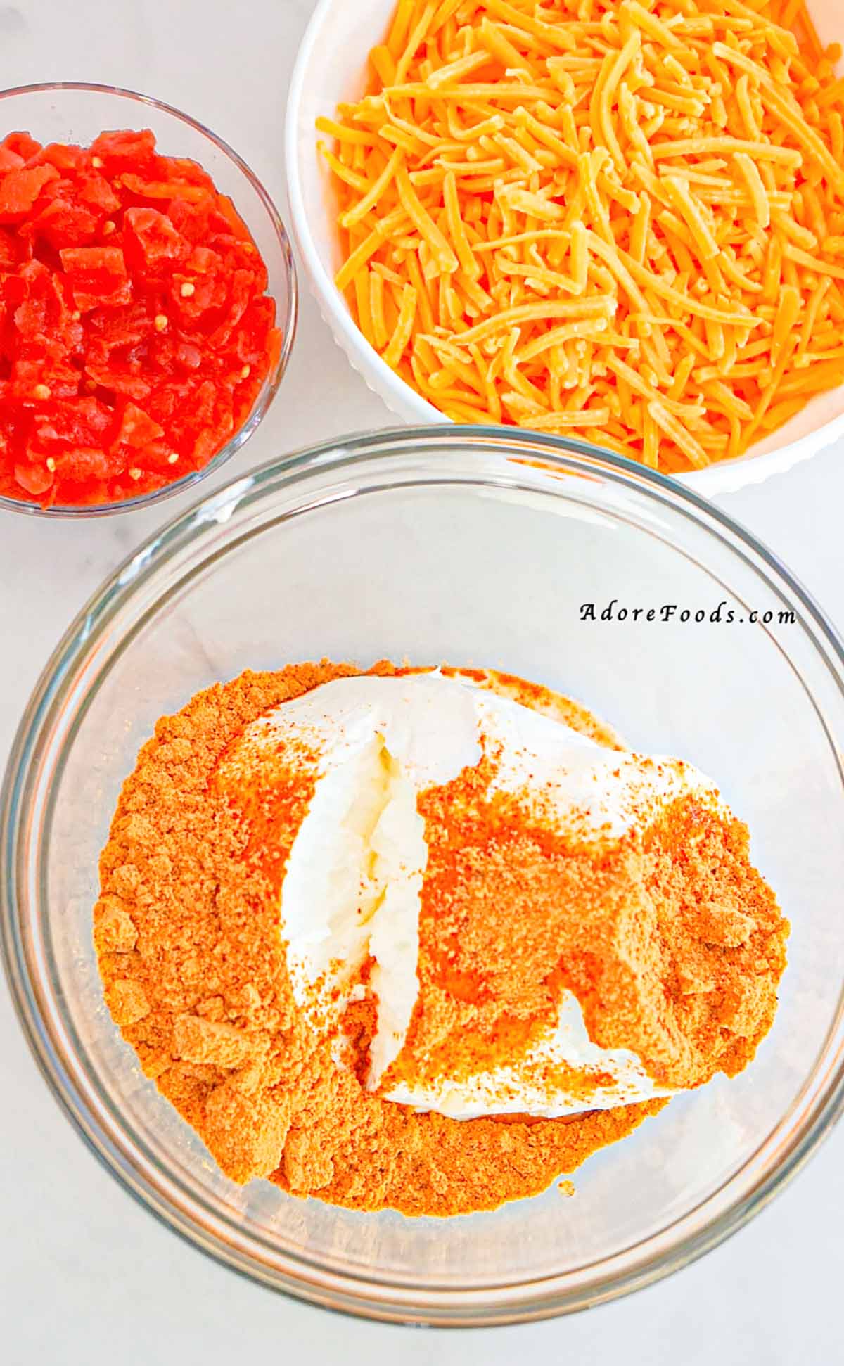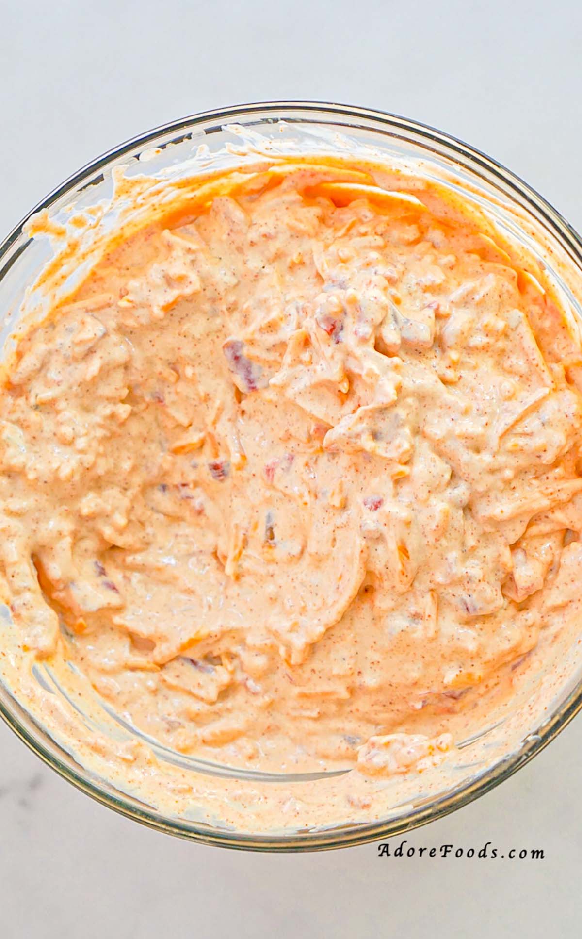 Mix all the ingredients in a large bowl and refrigerate for at least 2 hours to allow the flavors to meld together. Sprinkle some more cheese on top and add some sliced jalapenos before serving and enjoy with your favorite dippers.