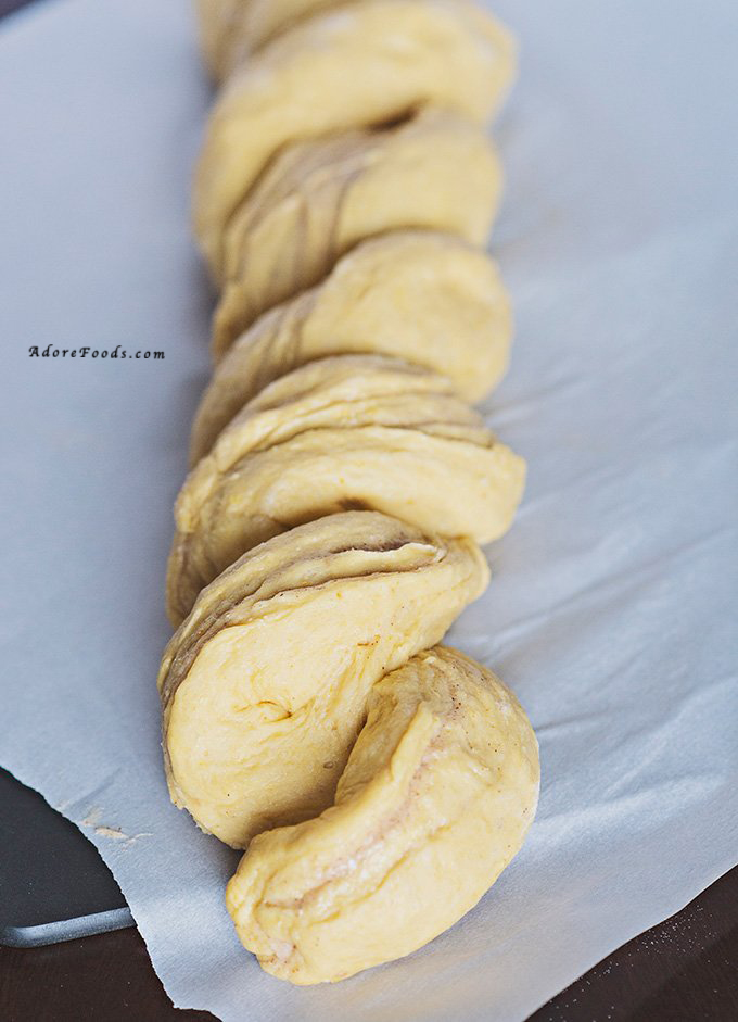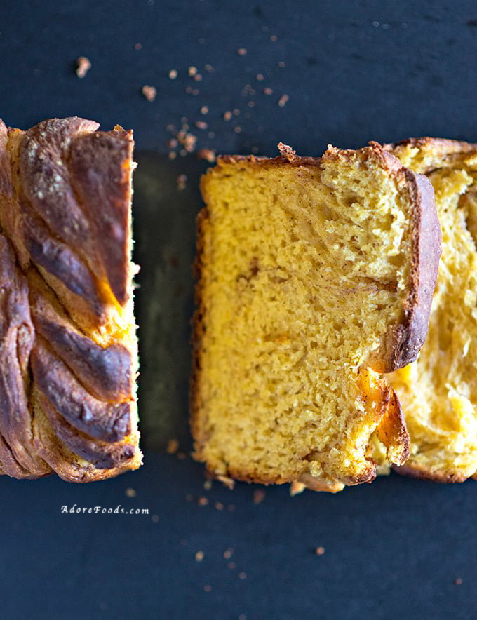 Just delicious! Moist, full of pumpkin flavor and spiced cinnamon between the doughy layers. You will not be able to stop from eating it! Just as I writing this I am having my second slice this morning 🙂