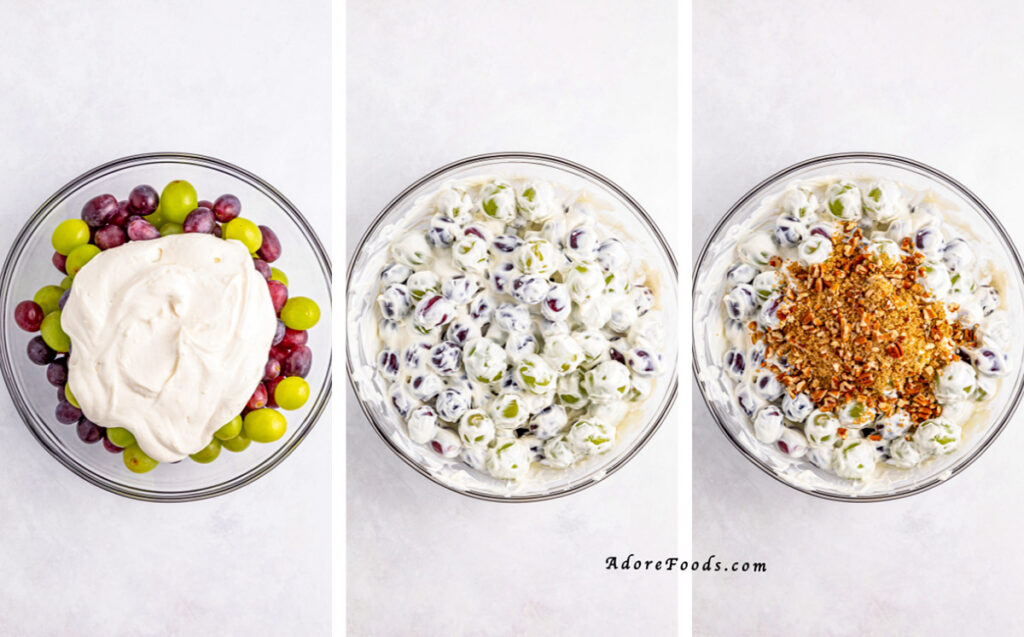 Pour the cream mixture over the grapes in a large mixing bowl. Gently fold everything together using a rubber spatula until the grapes are evenly coated.