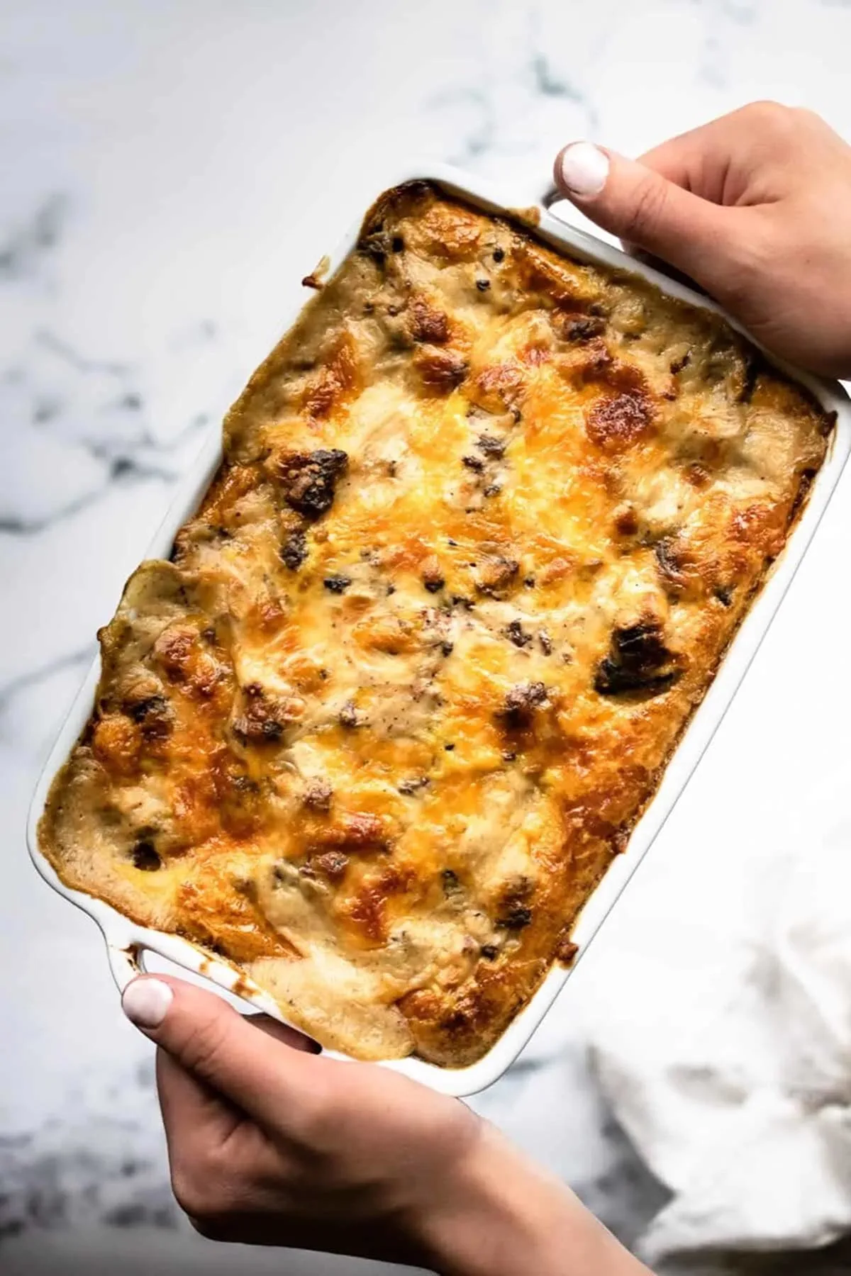 Looking for potluck casserole recipes for a brunch themed event? This Sausage Gravy Breakfast Casserole is pure morning delight. Layers of diced potatoes, fluffy beaten eggs, rich country sausage gravy, and ooey-gooey cheese, all baked together until it’s piping hot and bubbly.