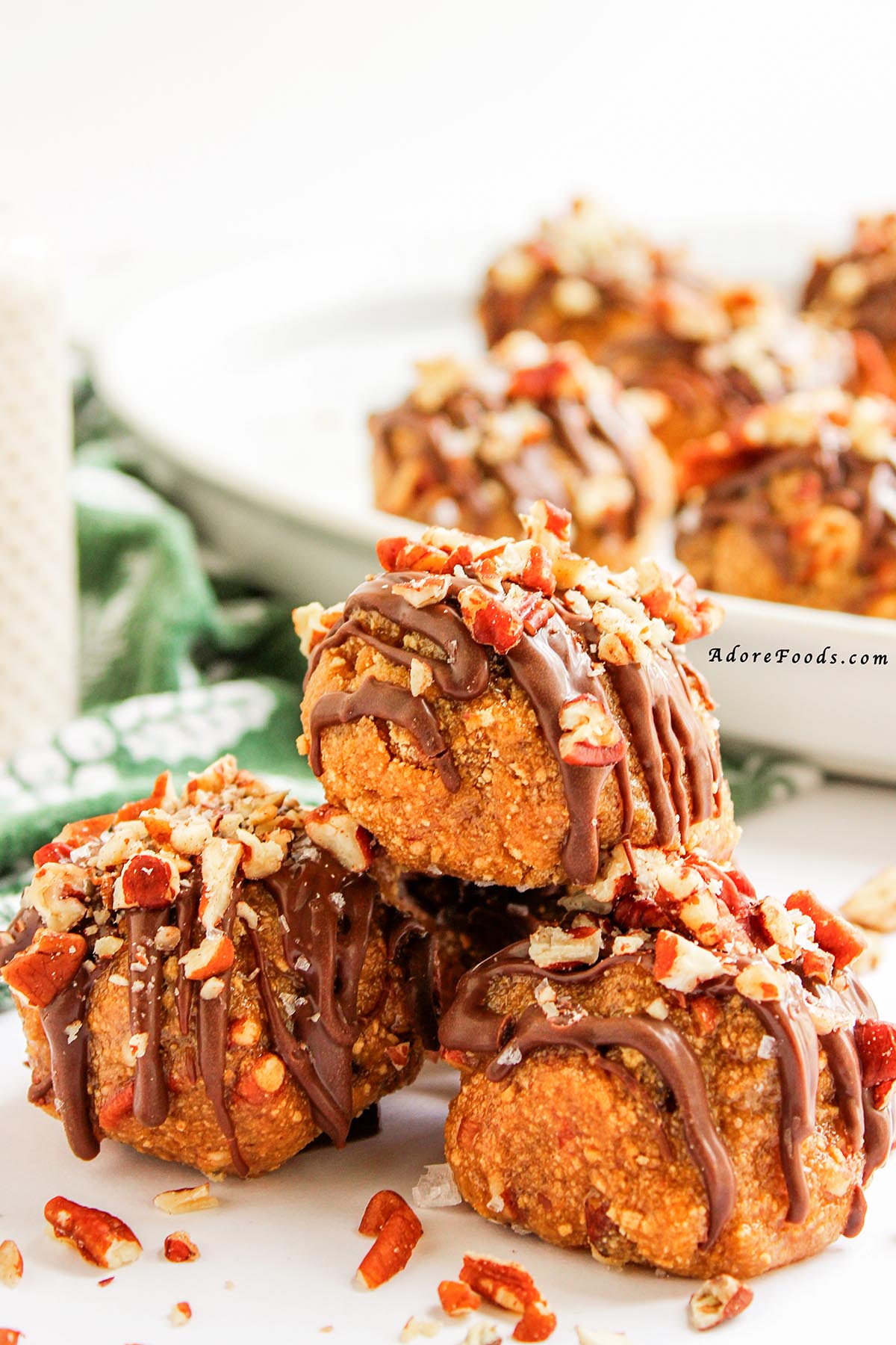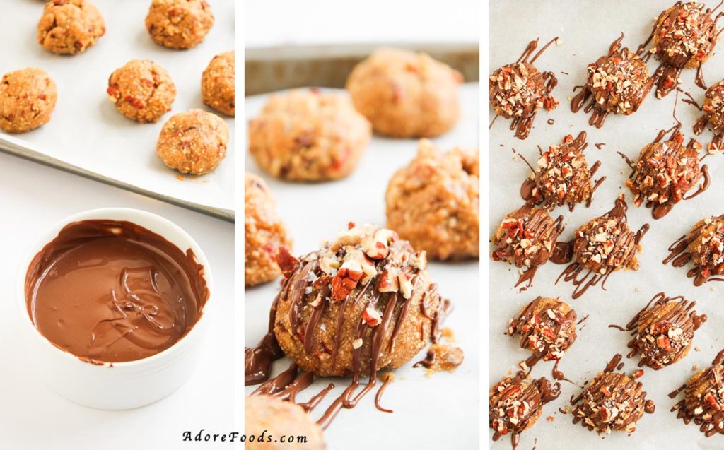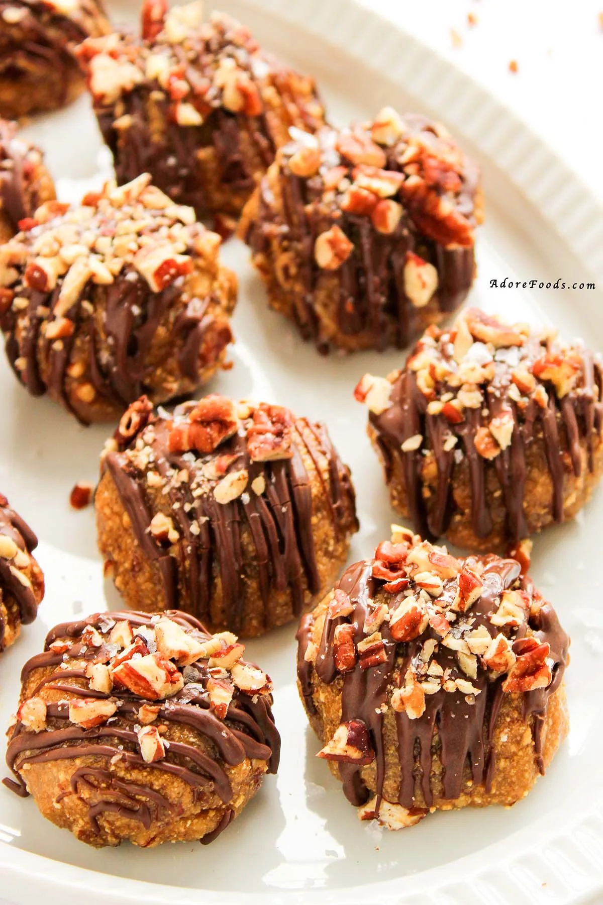Garnish and set: While the chocolate is still wet, sprinkle with chopped pecans or a pinch of sea salt. Let the coated balls sit at room temperature until the chocolate hardens completely.
