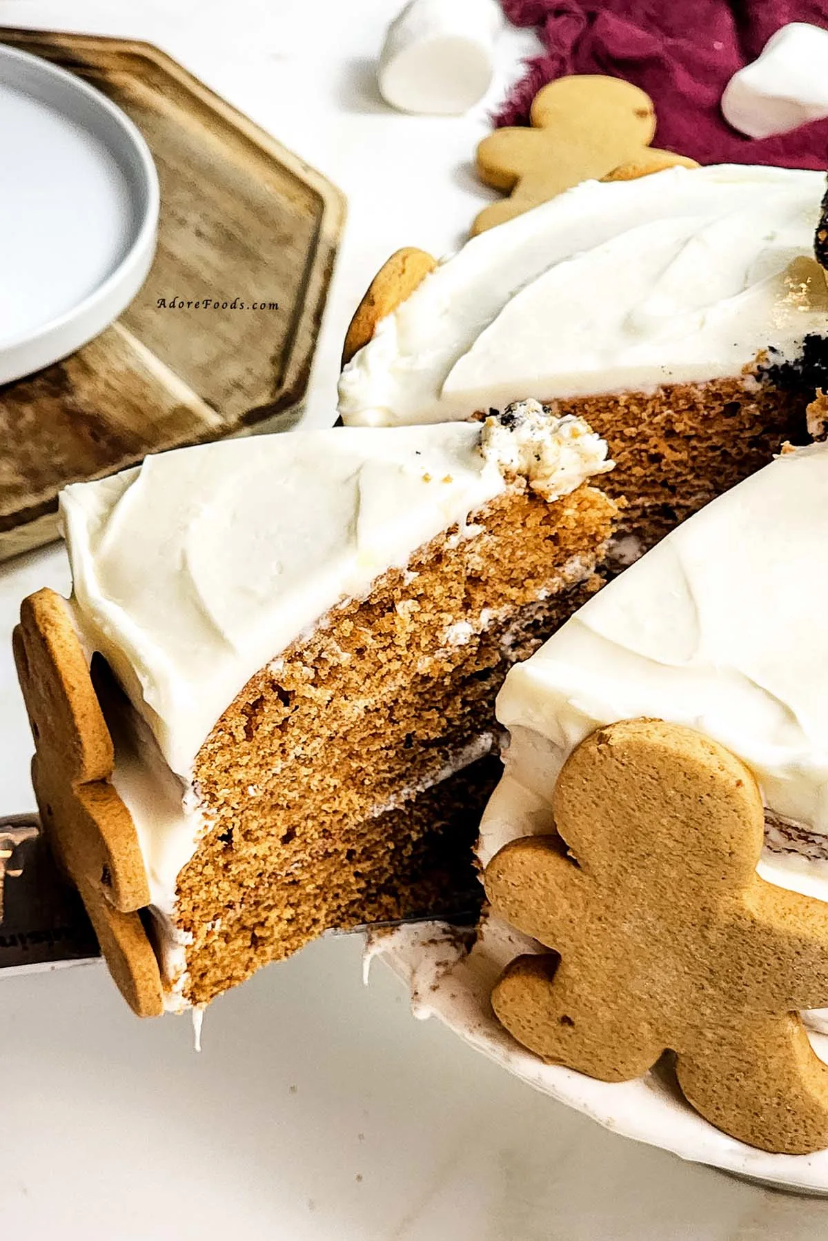 Optional: Pile large marshmallows in one corner of the cake and insert 2 gingerbread cookies standing upright from the top. Use a kitchen torch to lightly toast the marshmallows for a golden, campfire-style finish.