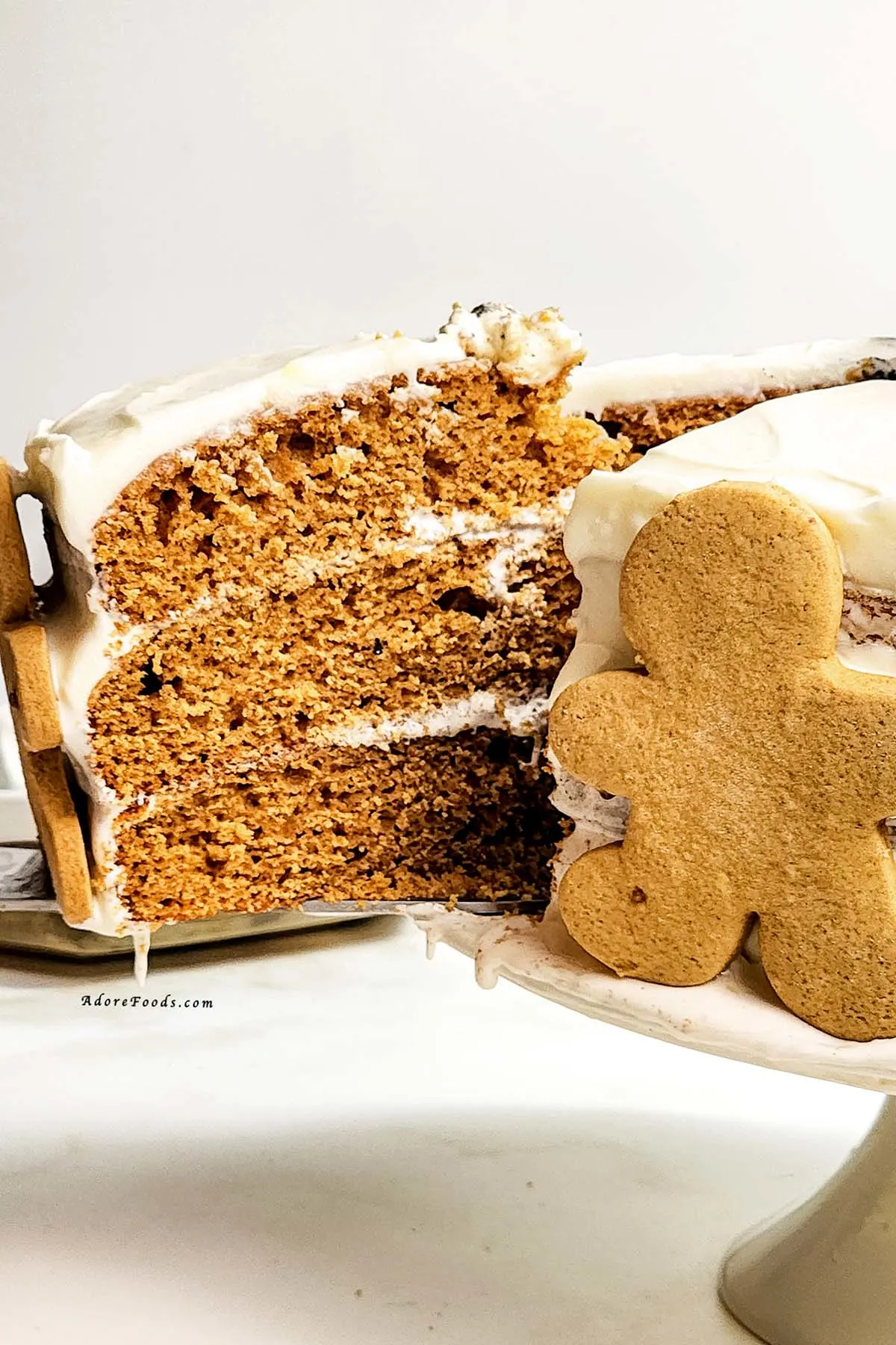 You can keep the Gingerbread Cake decoration simple with smooth buttercream and a cookie collar, or go festive with charred marshmallows, sugared cranberries, mini gingerbread men, or a light dusting of icing sugar.