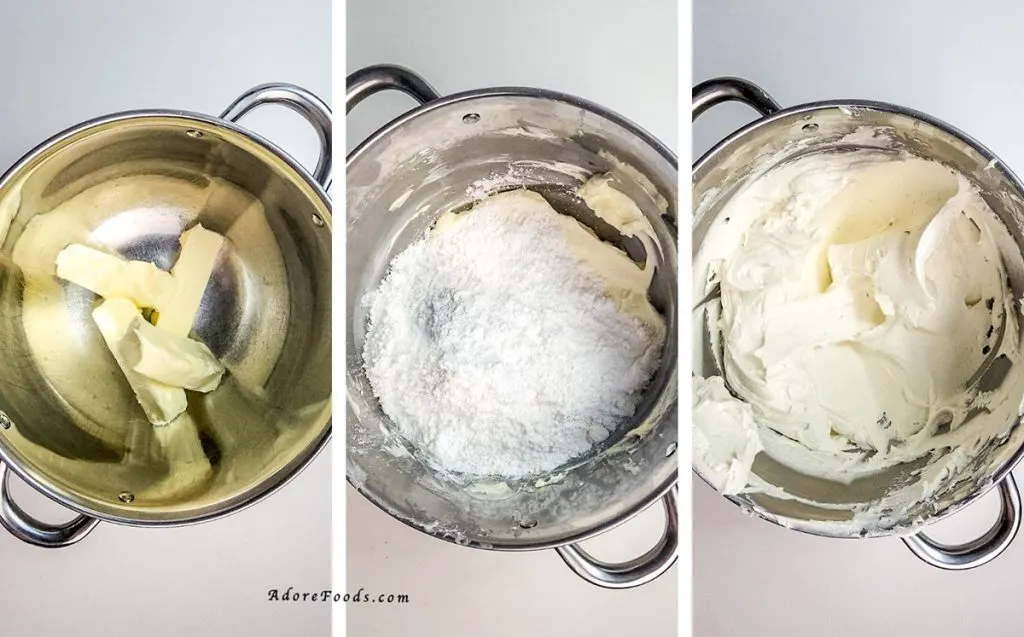 - Unsalted butter, 3 sticks (340 g), softened. Beat long enough to get pale and fluffy.