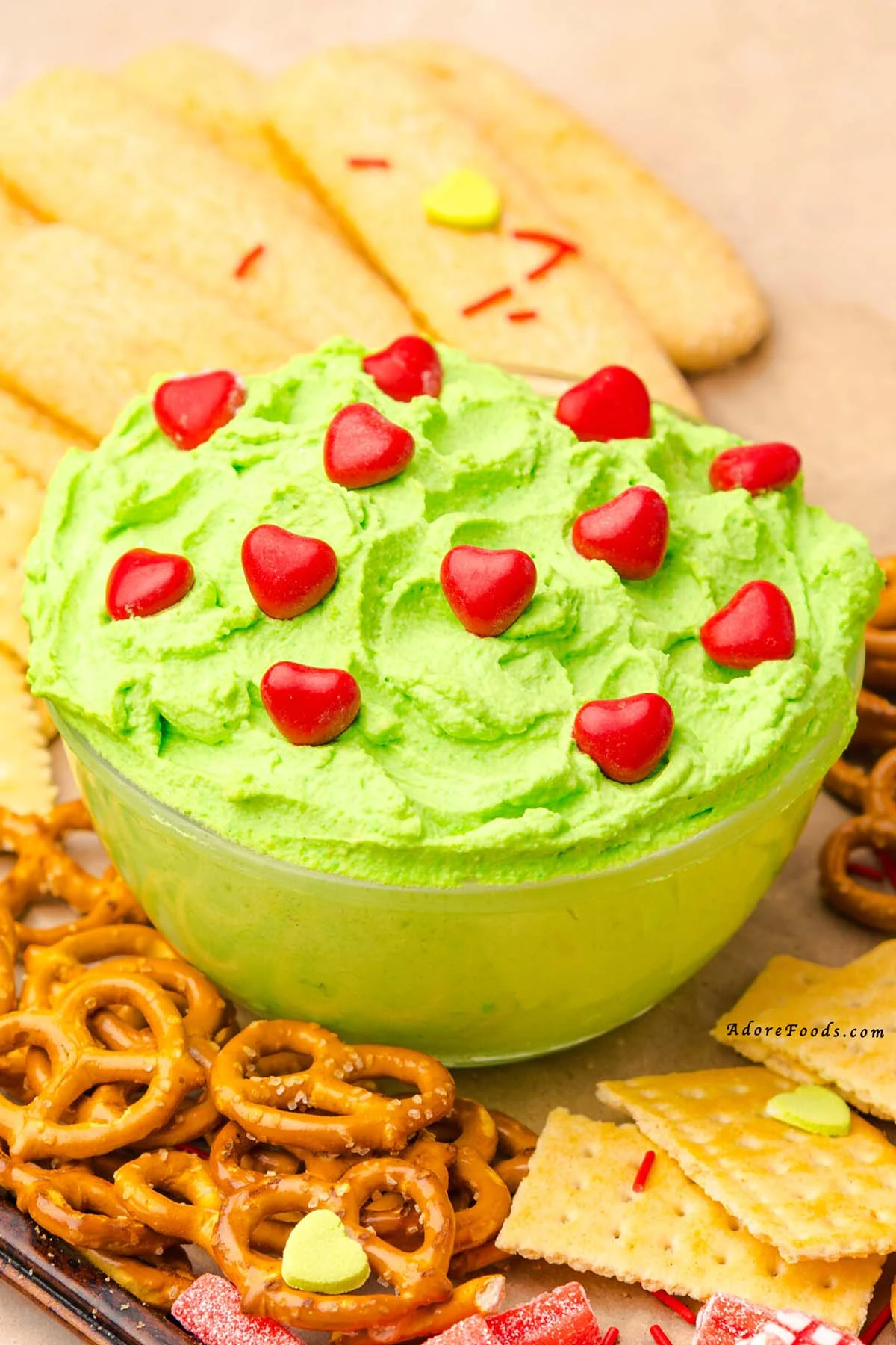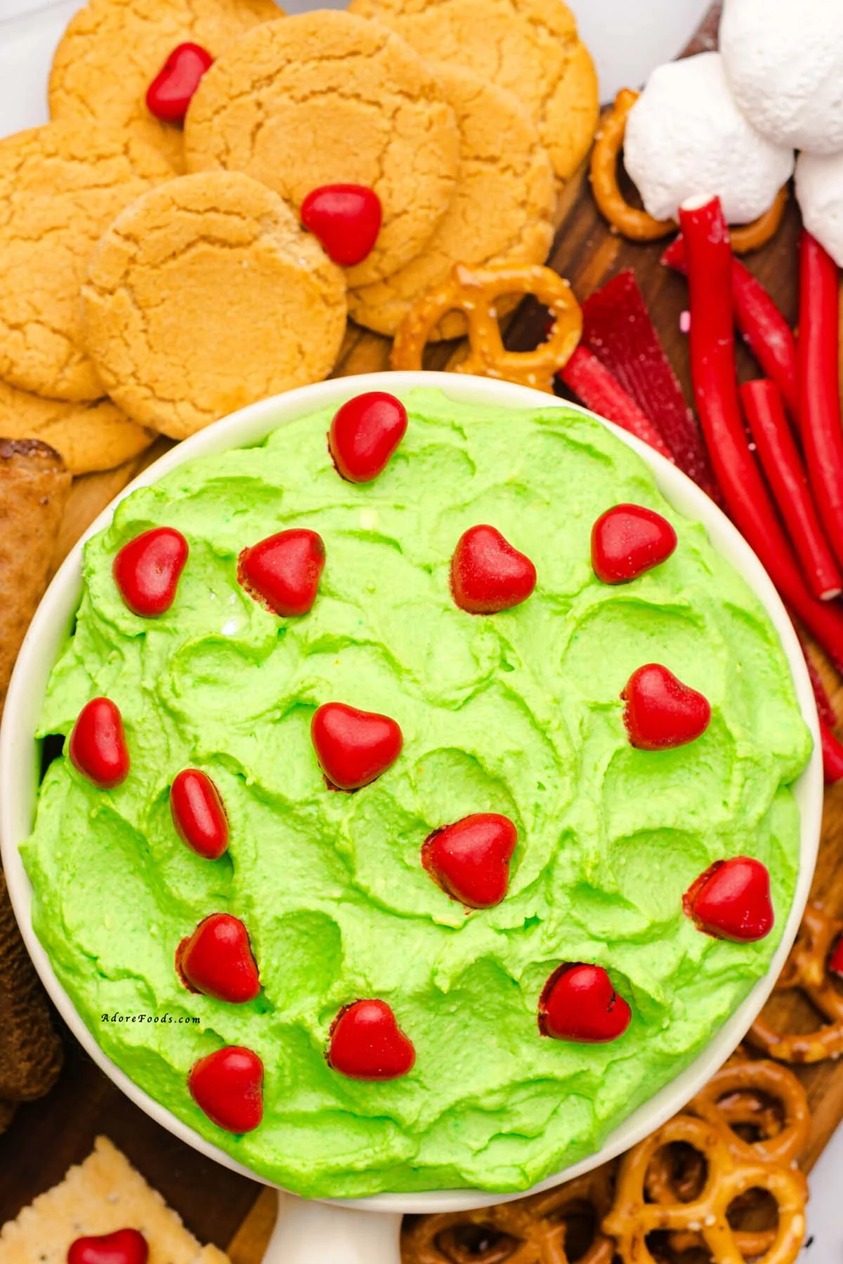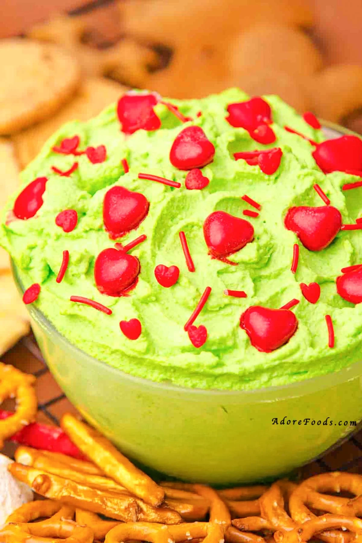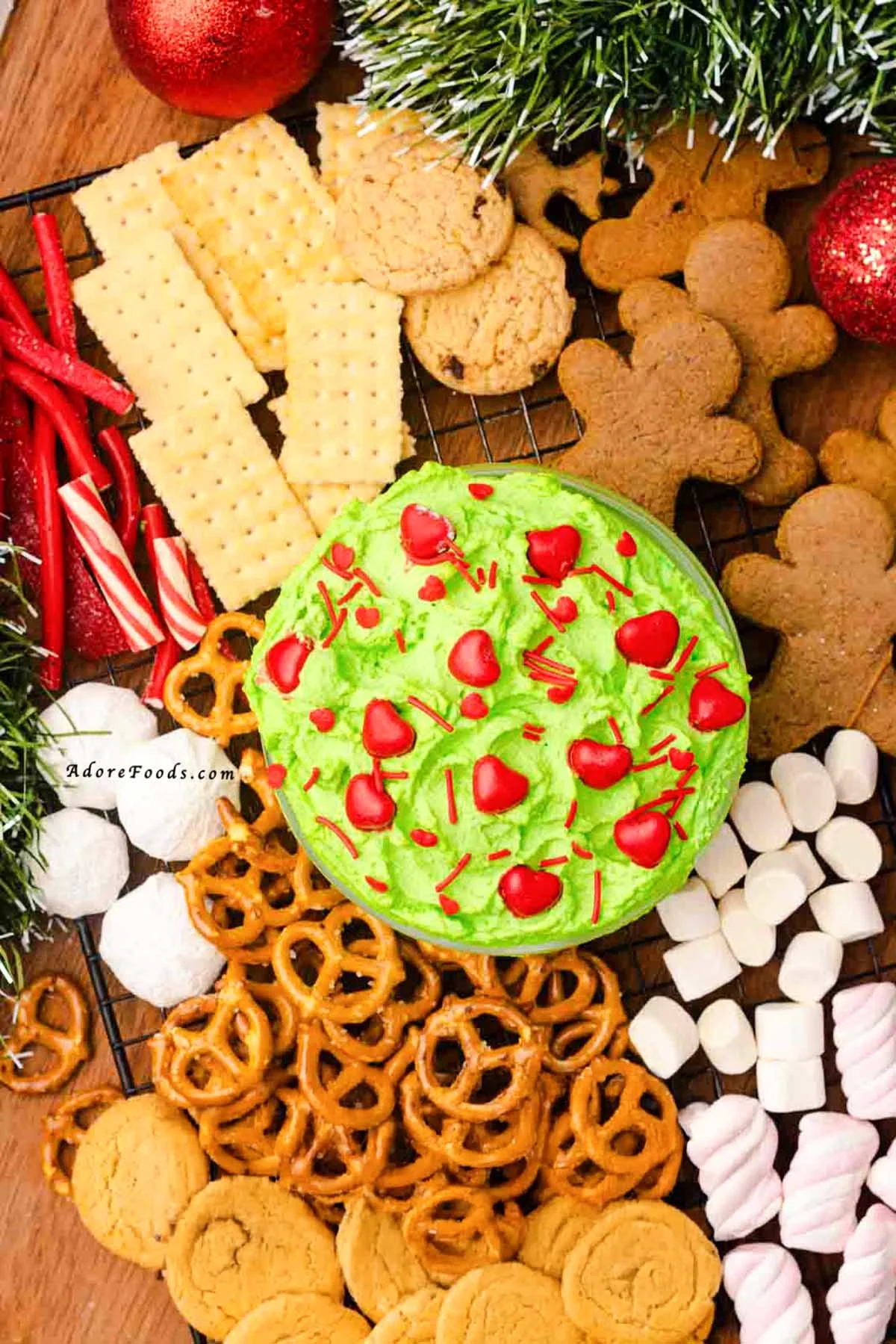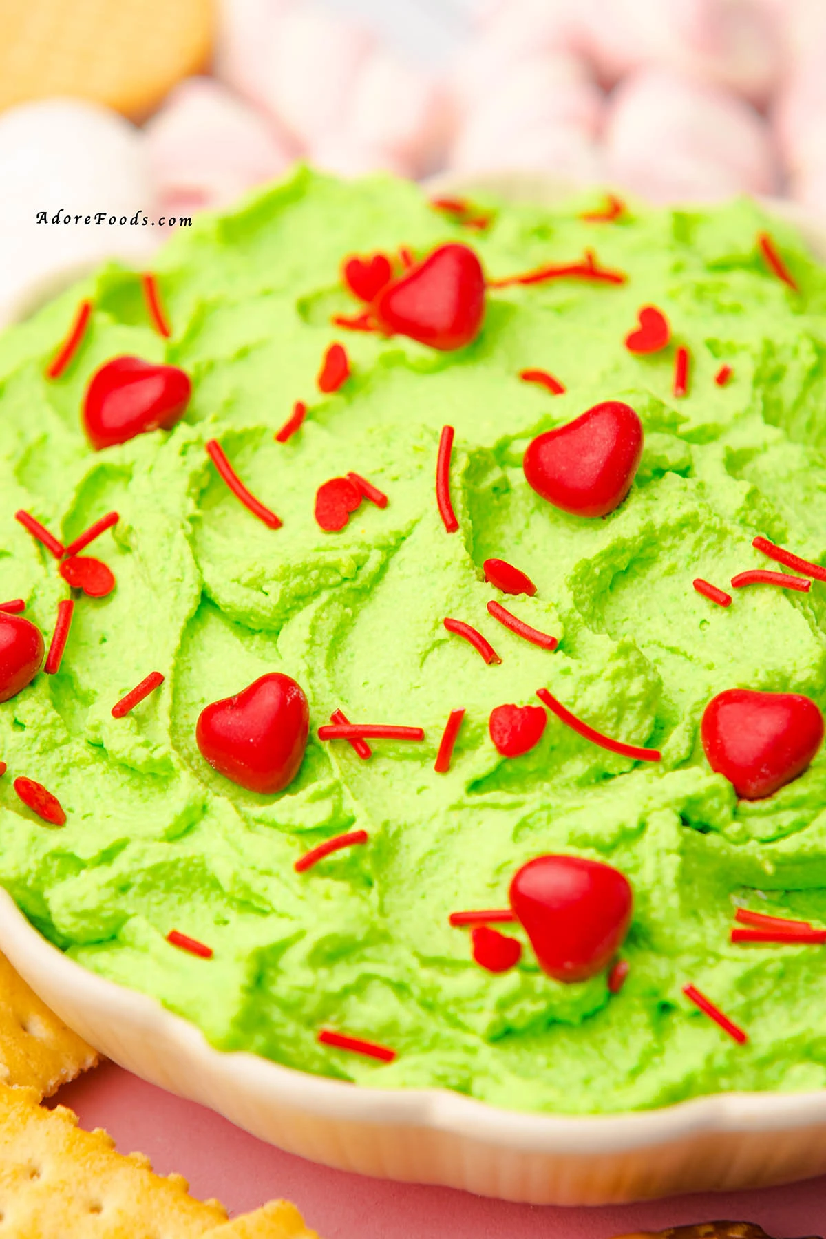 - Grinch Cheesecake Dip: Fold in crushed graham crackers and top with whipped cream and sprinkles.