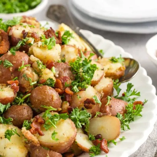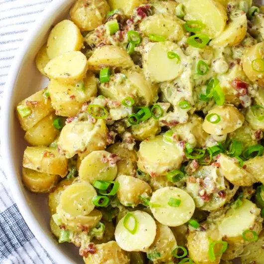 View Recipe HereThis authentic German potato salad is a perfect side dish for next summer's BBQ, potluck, or party. This authentic German potato salad recipe made with bacon, Yukon Gold potatoes, and a tangy dressing solves the problem of boring, creamy dressings. A warm, savory alternative that’s easy to make for quick dinners or large parties!I