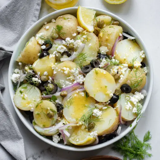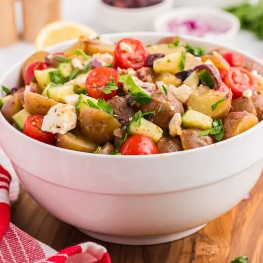 View Recipe HereThis Greek Potato Salad is a fresh, mayo-free twist on the classicpacked with tender potatoes, feta, olives, and a zesty lemon dressing. Perfect for summer!