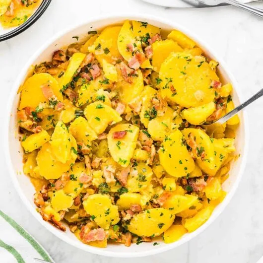 View Recipe HereHot German potato salad has tender, warm potatoes mixed with a slightly sweet and tangy dressing and is a delicious side dish for dinner, lunch and more!