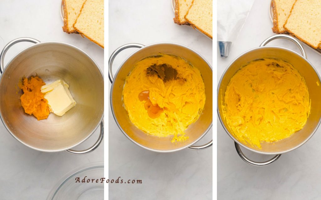 In a medium bowl, beat the softened butter and pumpkin puree together until light and fluffy.