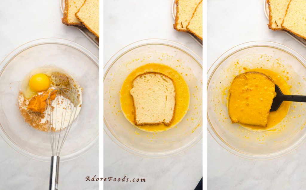 • In a shallow bowl or dish, whisk together the egg, milk, pumpkin puree, vanilla, pumpkin pie spice, and brown sugar until smooth.