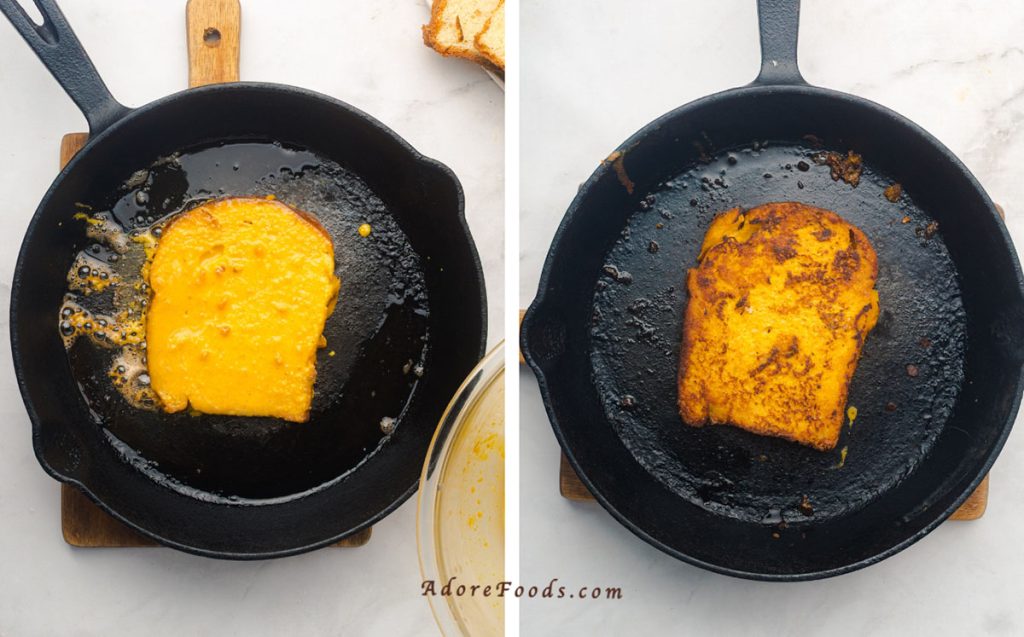 • Cook the soaked bread slices 2–3 minutes per side, or until golden brown and cooked through. Work in batches as needed, adding more butter to the pan if necessary.