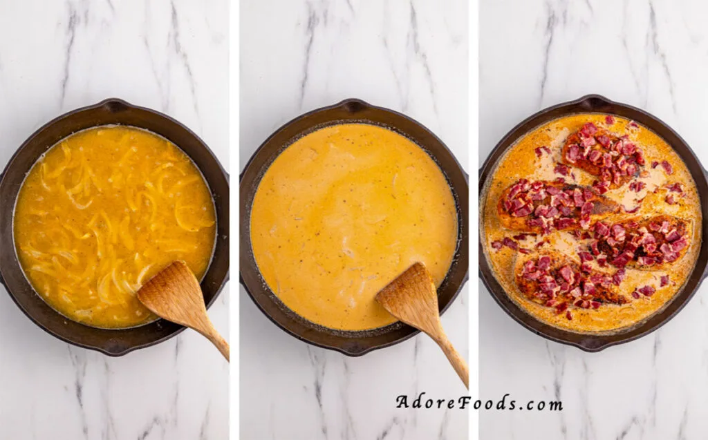 Smother It: Return the chicken to the skillet and top each piece with chopped bacon. Cover and simmer for 10–12 minutes or until chicken is fully cooked (165°F internal temperature).