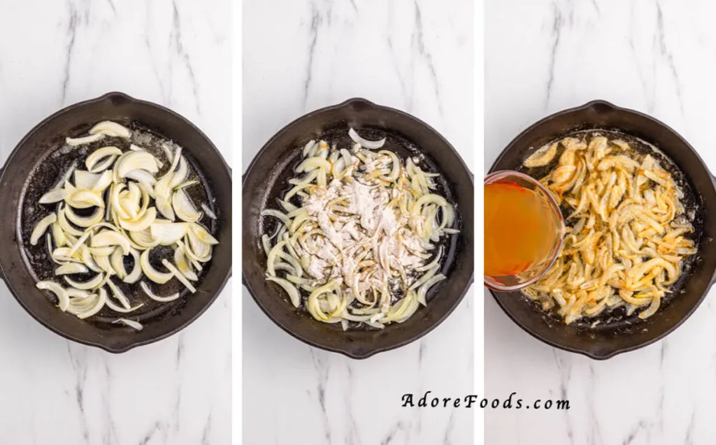 Make the Gravy: Sprinkle the reserved flour mix over the onions and stir for about 1 minute to cook off the raw flour taste. Slowly pour in the chicken broth, stirring constantly and scraping the browned bits from the pan.